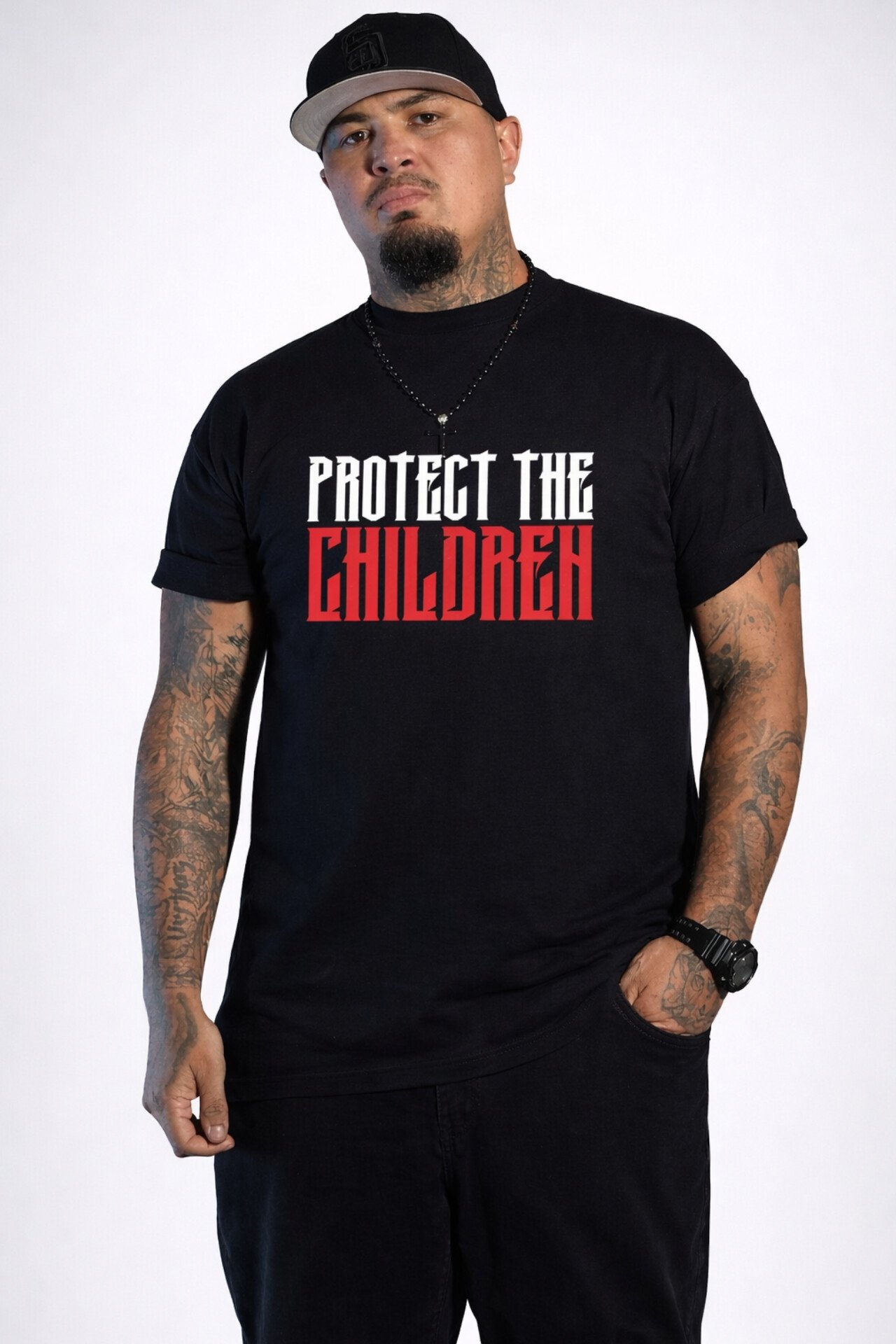 Clean and direct on the front, the statement says everything that needs to be said. On the back, the grim reaper stands as a symbol of consequence for those who harm the innocent.